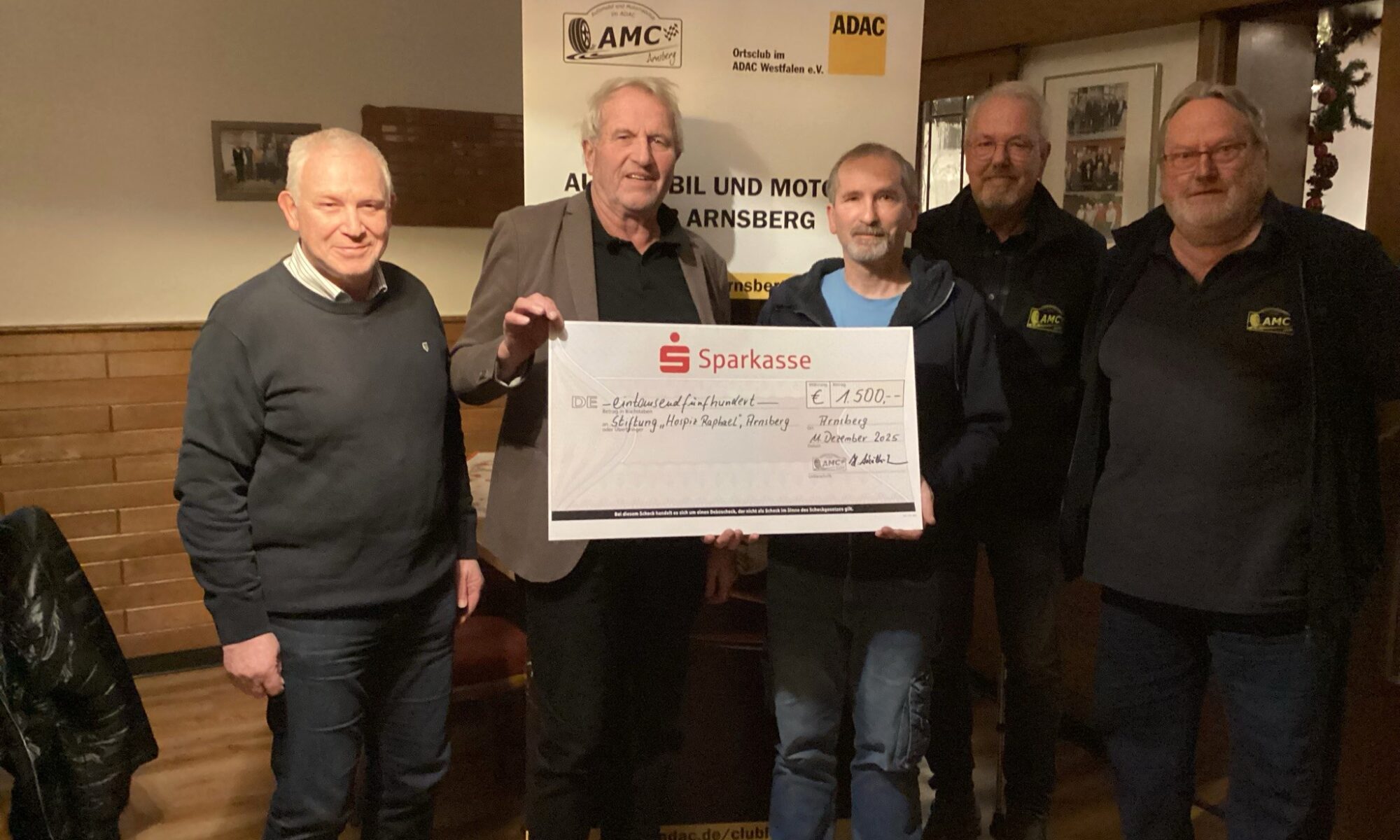 Eine großzügige Spende über 1.500 Euro überreichte der AMC Arnsberg jetzt an die Hospiz-Stiftung Arnsberg-Sundern. Im Clublokal des AMC übergaben der 1. Vorsitzende Heinz Schulte-Hobein sowie Touristikleiter Dieter Waldeyer und die Vorstandsmitglieder Bernd Ross und Udo Sroka den symbolischen Scheck an den Vorsitzenden der Hospiz-Stiftung, Herrn Dr. Wilhelm Geldmacher.